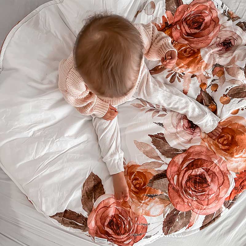 With a whimsical mix of Roses and leaves in natural hues, the Blithe Playmat is going to be your little love’s best little playmate.