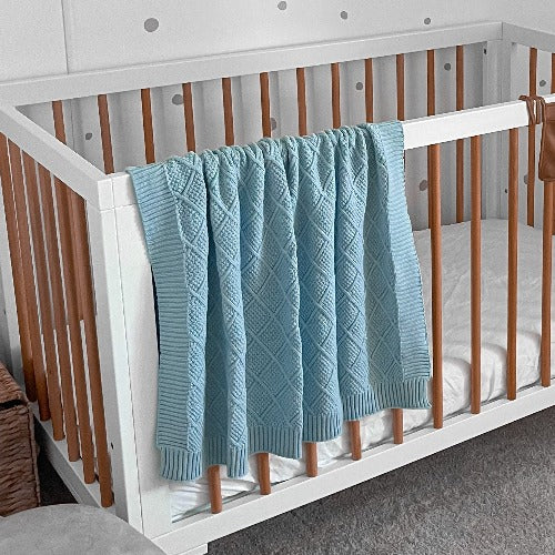 Our knitted blankets are the perfect excuse to snuggle up with your little one. Match them along with one of our Ocean Fitted Cot Sheets for the most beautiful natural nursery.