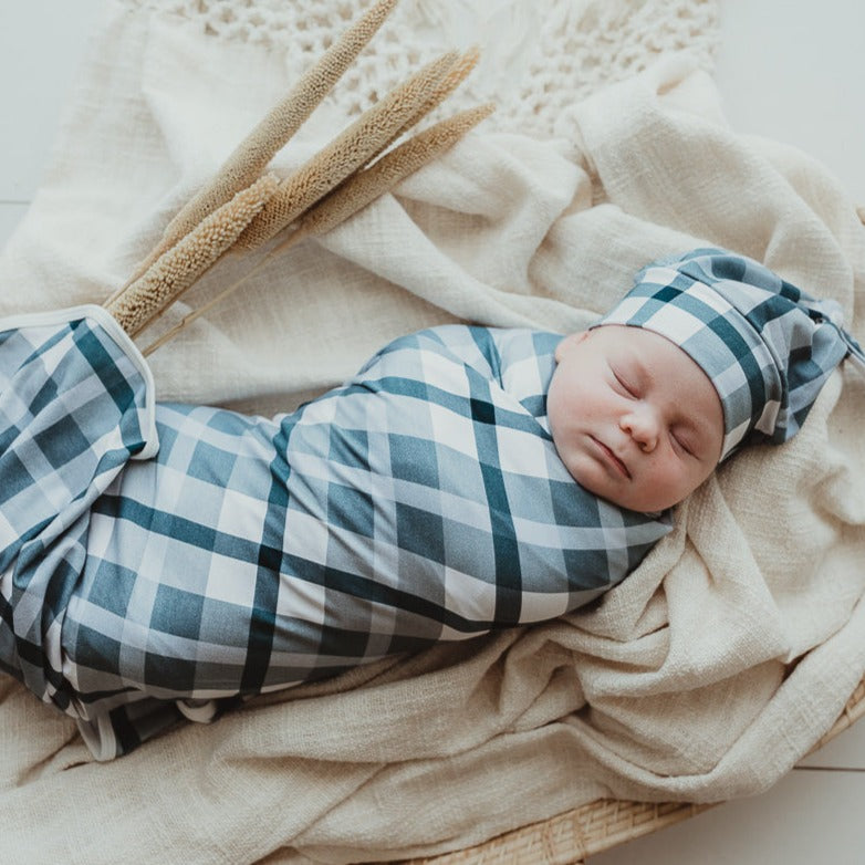 Cyprus Plaid Jersey Swaddle Stretch Wrap & Beanie Set
