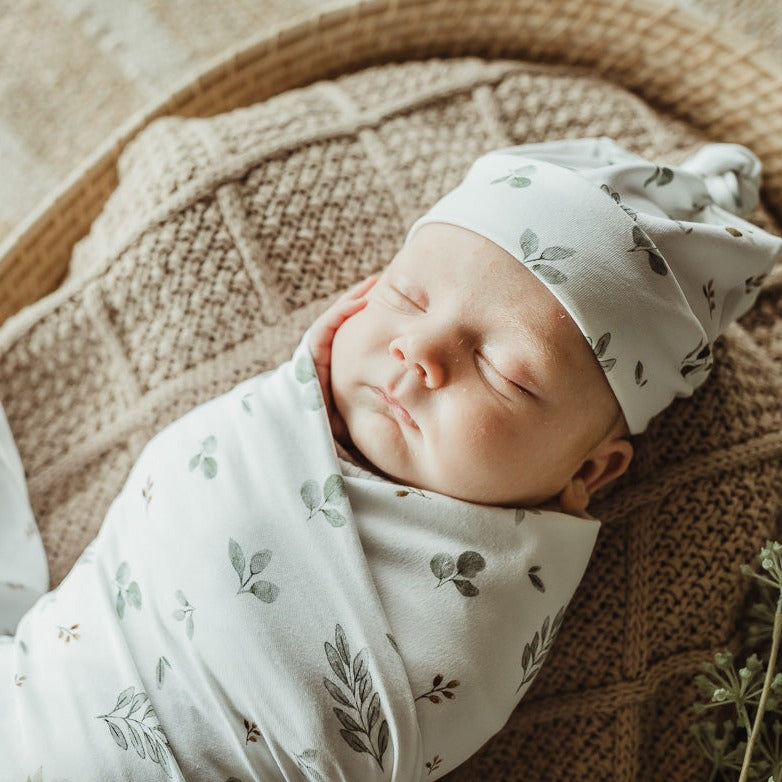Perfect for newborn swaddling, as a baby wrap, or a cherished blanket for toddlers, the "Eucalypt Fall" design is versatile and stylish. Its flexible stretch ensures a snug fit for babies of all sizes, while the sophisticated eucalyptus pattern adds a touch of elegance to your baby's essentials.