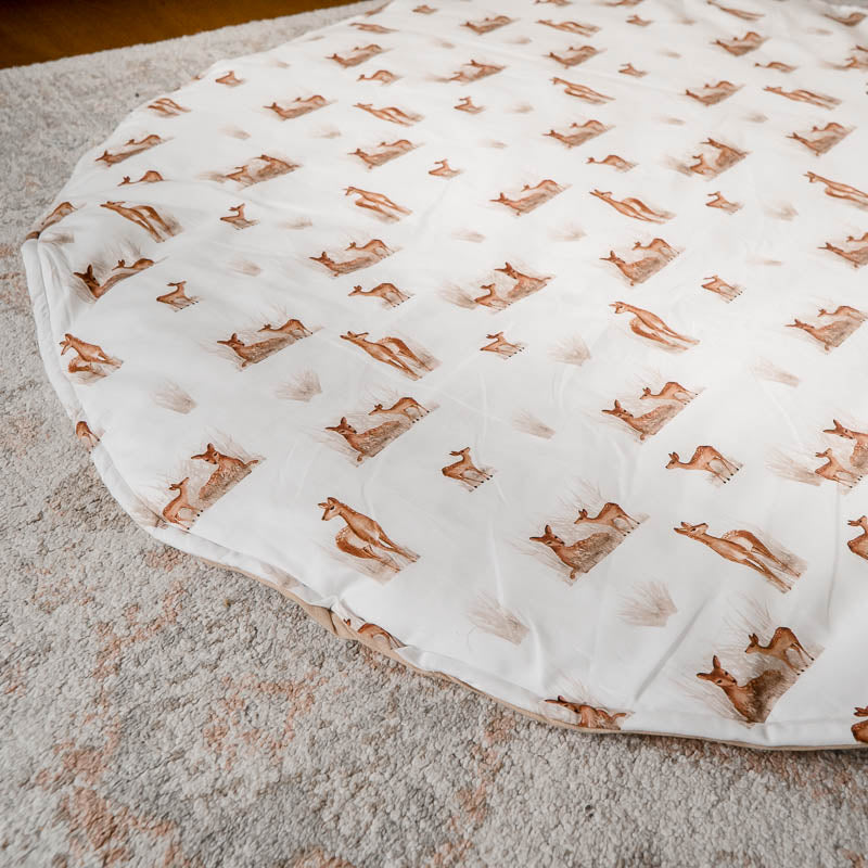 With a whimsical mix of mother and baby deer in natural hues, the Fawn Playmat is going to be your little love’s best little playmate.