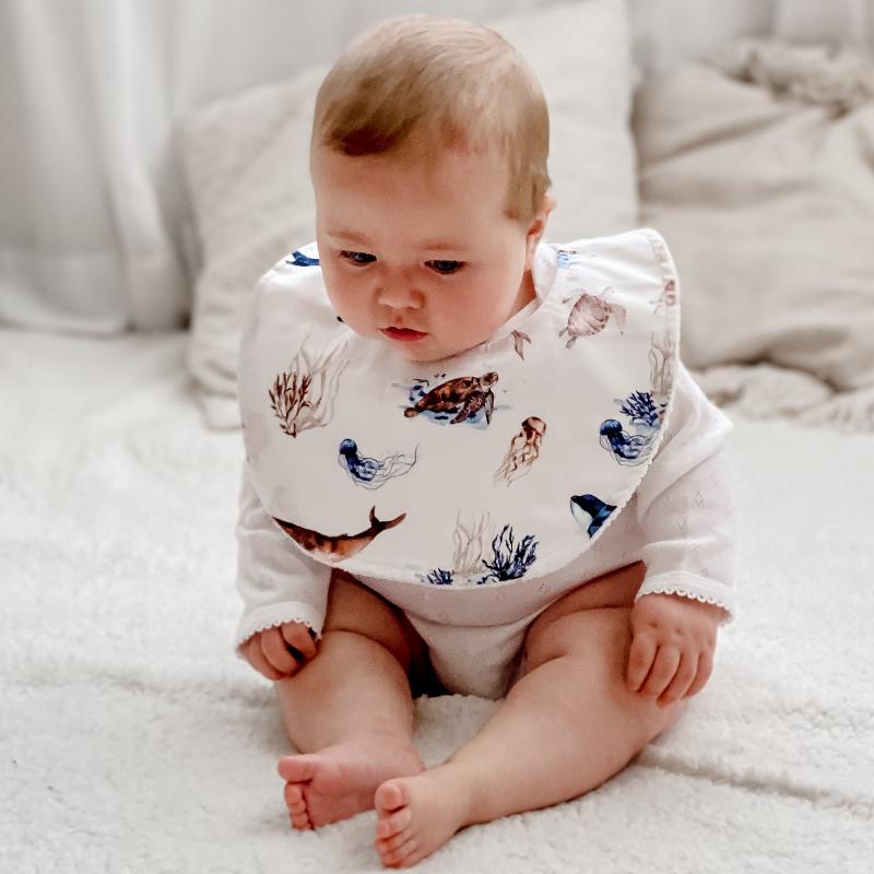 Explore the wonders of the sea with the Ocean Bib, providing comfort and protection while keeping your baby stylish during mealtime.
