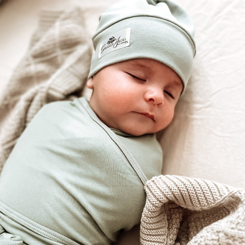 ~ Replicating the comfort of the womb, the Snuggly Jacks Sage Jersey Swaddle Stretch Wrap and Beanie combo is a hospital bag and birth announcement essential. ~
