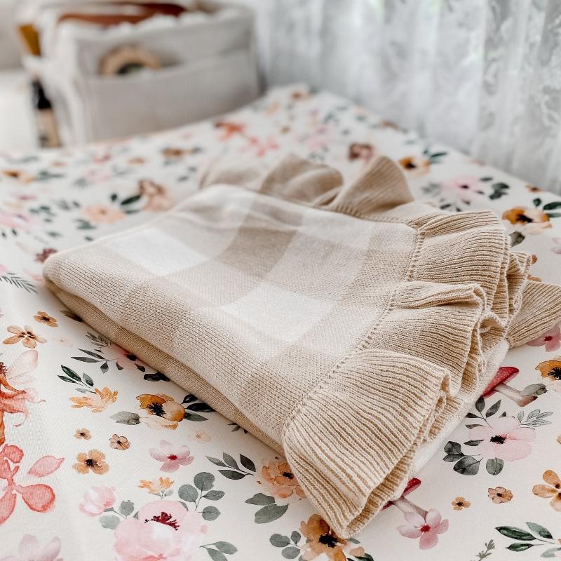 Knitted sand gingham baby blanket with frill edges, paired with floral nursery bedding for a cozy and elegant look.