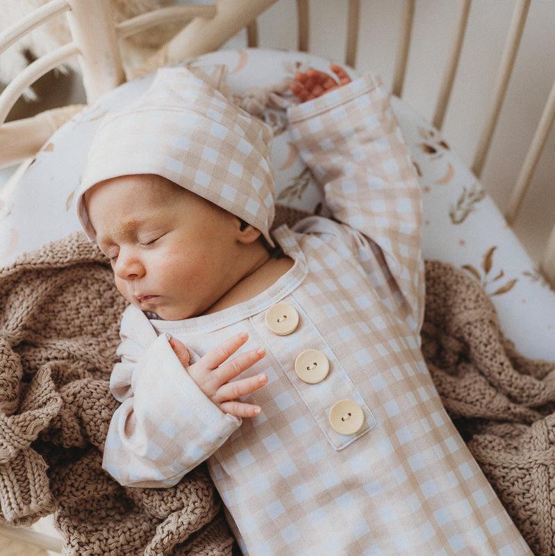 Complete with the sweetest tortoise brown buttons, matching beanies and fold-over mittens to avoid little scratched faces, the Snuggly Jacks knotted gowns are a wardrobe essential that simplify parenting life and keep your little love happy, safe and comfortable.