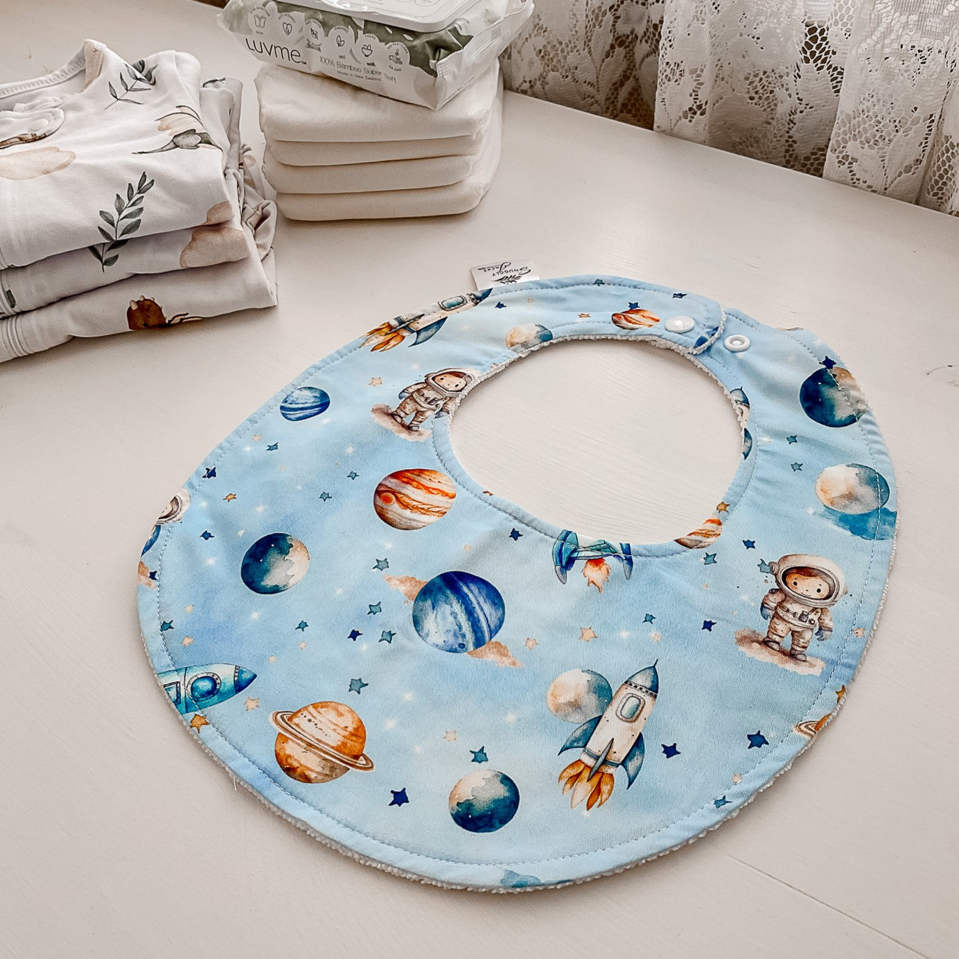 Launch into a mess-free mealtime with the Space Rockets Bib, where style meets functionality for your little explorer.