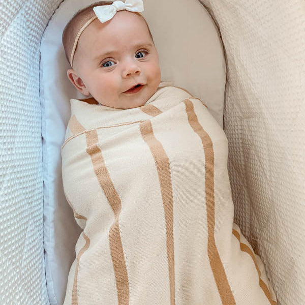 ~ With hints of Spring, the Toffee Stripe Organic Knitted Blanket is the perfect element of style for your little love and your nursery.~