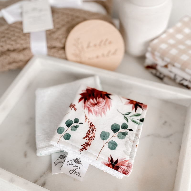 These cotton wash cloths measure 20cm by 20cm making a perfect size for your little one. Soft and easy to get under those little arms and between the sweetest of little feet. Our wash cloths feature a microfiber toweling backing and of cause our beautiful 100% cotton unique prints on the front.
