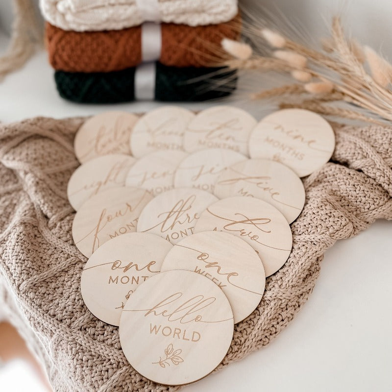 Capture your newborn baby’s first week, month and year with our gorgeous Wooden Baby Milestone Disc set to cherish forever and share your baby’s first special moments with your family & friends. Pair perfectly with any of our wraps or fitted sheets.