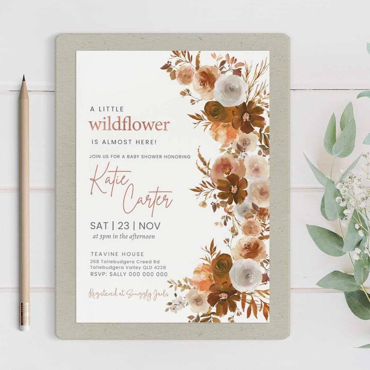 Create the most beautiful personalized baby shower invitation. This invitation is created from our Willow Nursery RangeThe printable or emailable invitation files are a quick and affordable way to create the most elegant baby shower. You could print at home or visit a printing service such as Kmart or Officeworks. Print on paper 5 x 7'' Paper.